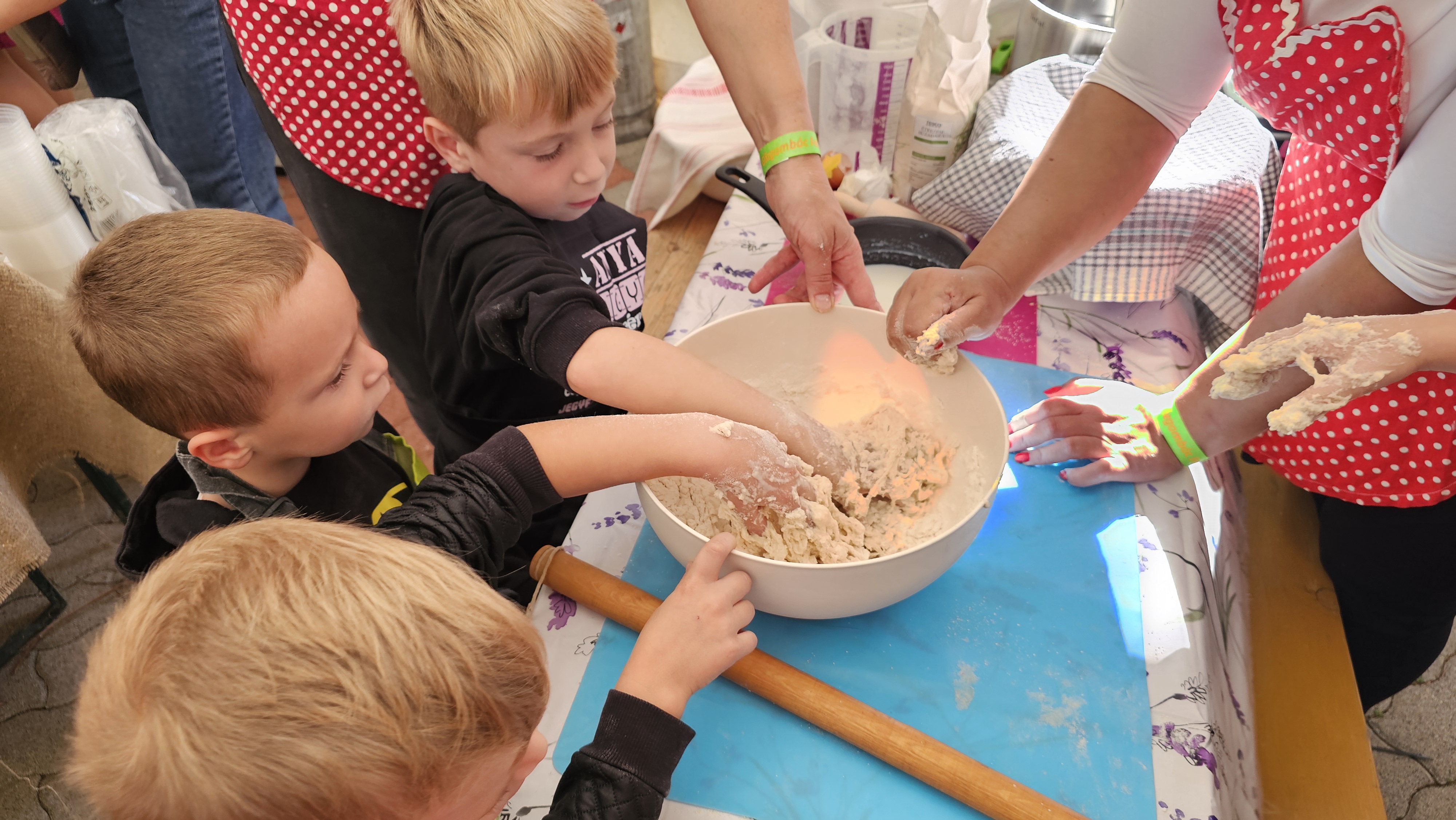 Az esemény fénypontja idén is a gőzgombóc-készítő verseny volt, amelyen mi is részt vettünk a cica csoporttal. Már a készülődés is igazi kalandnak bizonyult, a kicsik nagy lelkesedéssel gyúrták a tésztát, formálták a gombócokat, és kíváncsian figyelték, hogyan alakul át a közös munkánk finom étellé. Bár a konyhai folyamatokban mi is segítettünk, a gyerekek lelkesedése adta a recept igazi titkos hozzávalóját. A csapatunk a hagyományokhoz hűen a sós "Héviknédlit" készítette babgulyással. A fesztiválon nemcsak főztünk, hanem rengeteg színes programban is részünk volt. A gyerekek izgatottan nézték a a geresdlaki óvodások táncát és az ismert dalnál "Hallo, hallo schön dass du da bist" énekelhettek is. Természetesen a gőzgombócok kóstolása sem maradhatott el. A finom illatok, a színpad előtti vidám zene és a vásári hangulat mindenkit elvarázsolt. Külön öröm volt látni, hogy milyen sokan összegyűltek az ország minden részéről. A rendezvény nemcsak gasztronómiai élményt nyújtott, hanem igazi közösségi ünnepé vált. A szülők, gyerekek, nagyszülők együtt kóstolgatták a gombócokat, beszélgettek és nevettek, ez a bensőséges, családias hangulat talán a fesztivál legnagyobb értéke. A gyerekek élményekkel gazdagon térhettek haza.