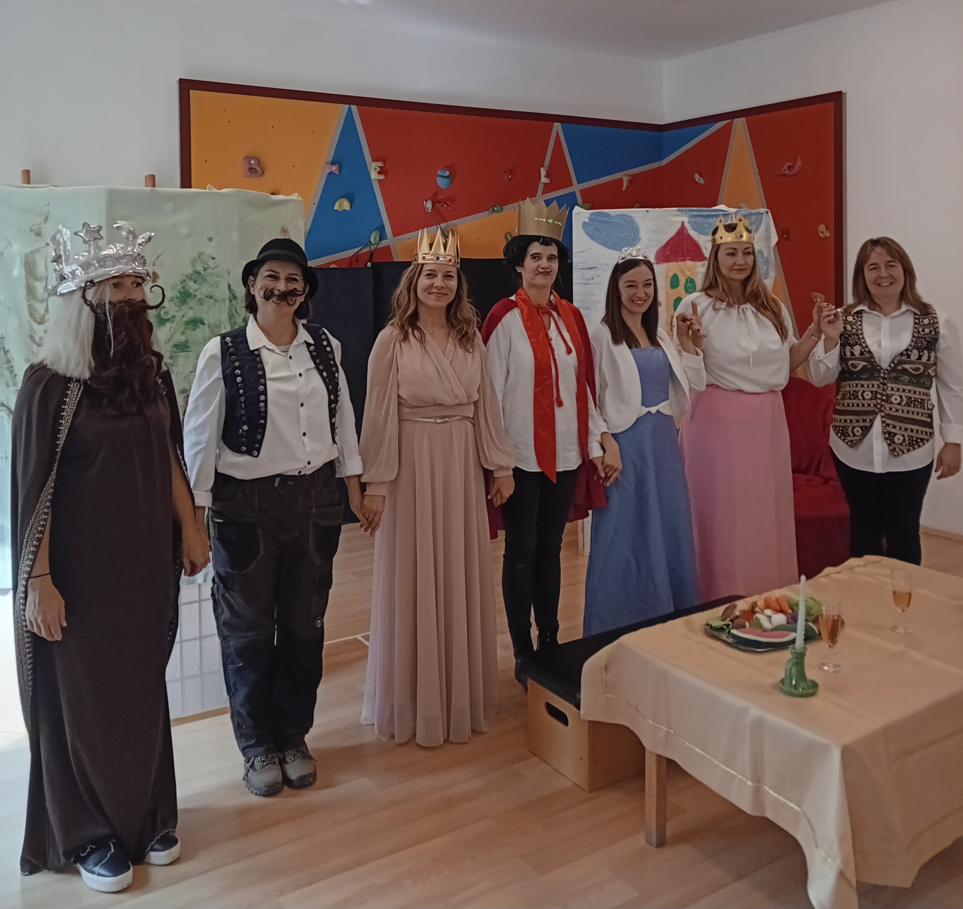 A témában hagyományunkhoz híven három közös programot hirdettünk. Előzetesen kértük a családokat, hogy nézzenek körül a könyvespolcaikon és ha találnak 1970-es évek előtti Benedek Elek műveket, hozzák be az óvodába. Négy csoportból, hat régi mesekönyv érkezett, ezeket az óvoda bejáratánál lévő vitrines szekrénybe állítottuk ki. Hétfőn „Mesebeli Hétpróbát” rendeztünk. Az óvónők meseszereplőknek öltözve 7 helyszínen várták a gyerekeket, hogy kiállják az ügyességi próbákat. Fiúk, lányok együtt küzdöttek a teljesítő pecsétekért, hogy a saját csoportjukon belül ők nyerjék el méltó jutalmukat, a királyi és királynői koronát.